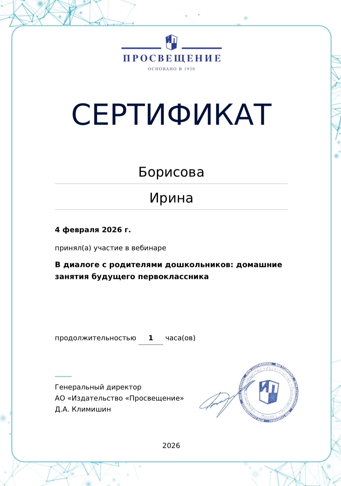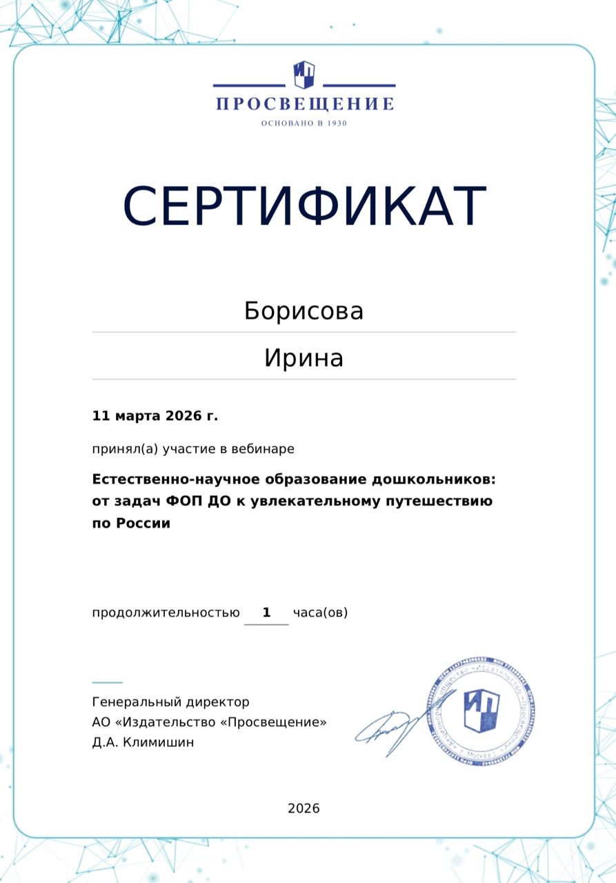 Сертификат приняла участие в вебинаре
