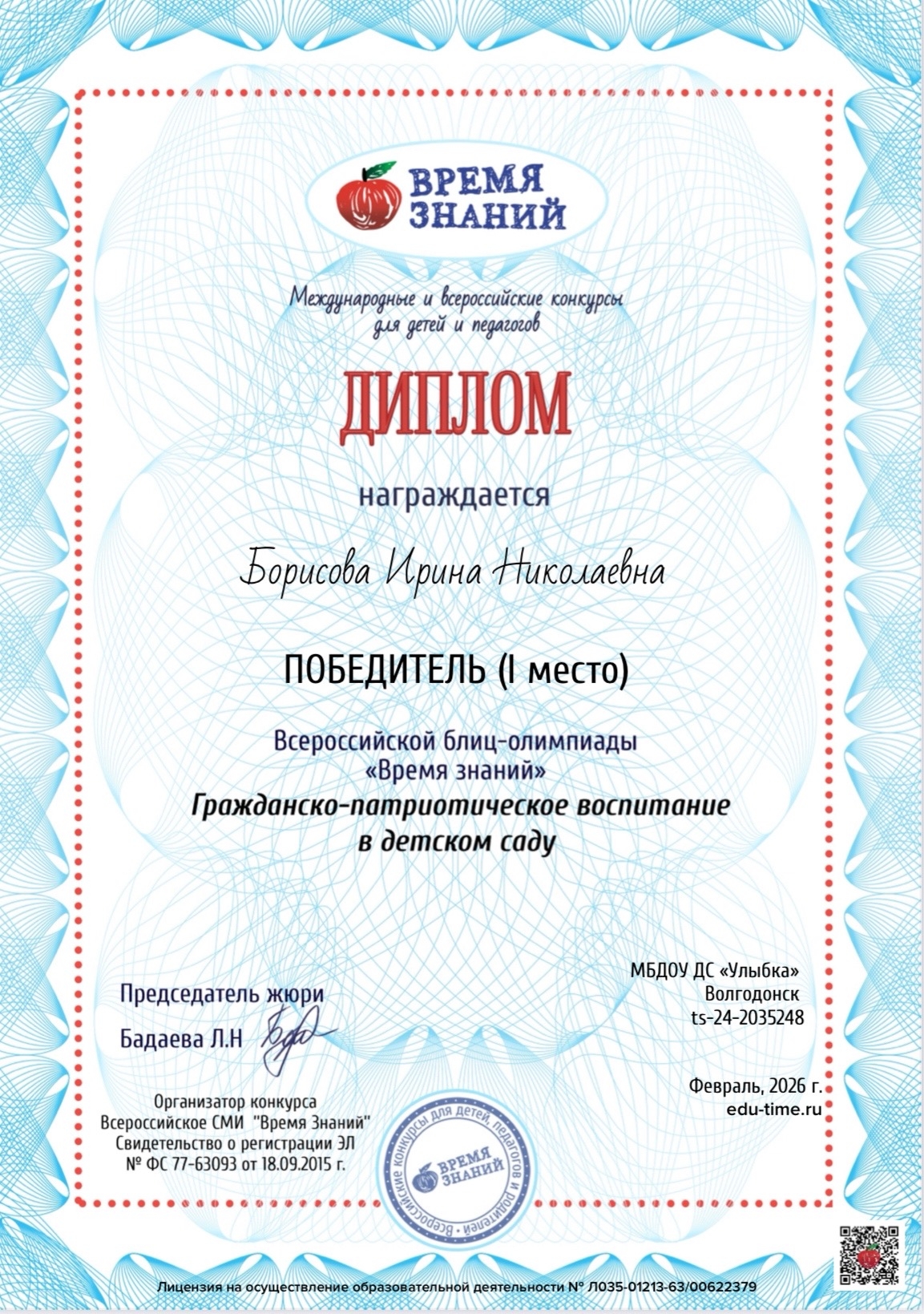 Всероссийской блиц-олимпиады «Время знаний»