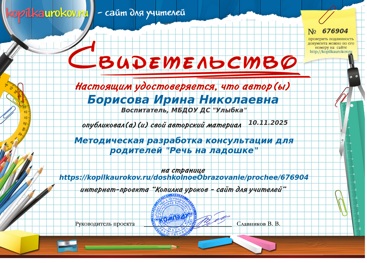 Методическая разработка консультации для родителей "Речь на ладошке" // 2025.